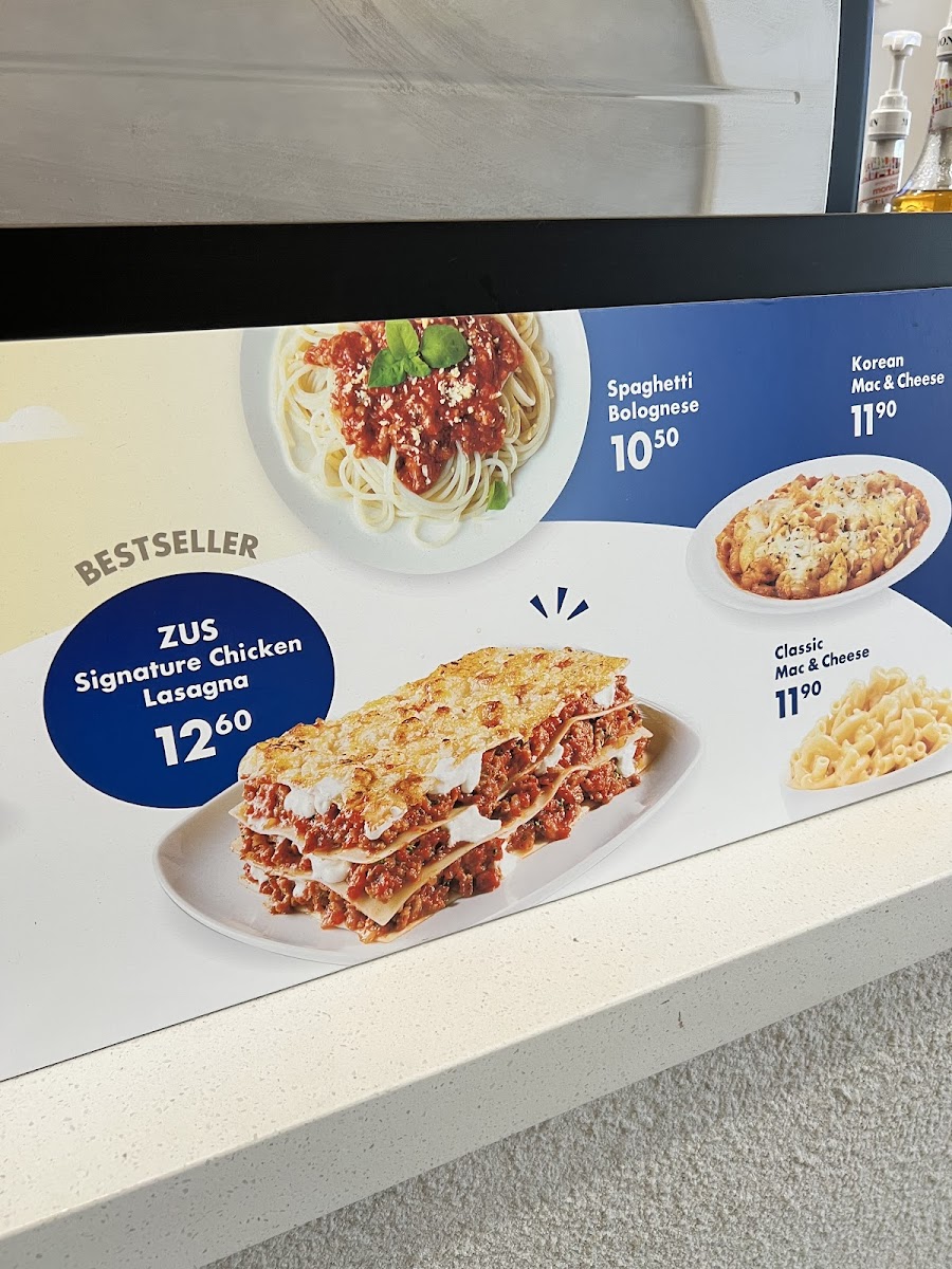 - All Day Brekkie: Includes various baked goods and light savory snacks, such as Chocolate Roll, Tom Yum Chicken Puff, ZUS Signature Curry Puff, and Chicken Slice & Cheese Croissant, serving as breakfast or light meal choices throughout the day.